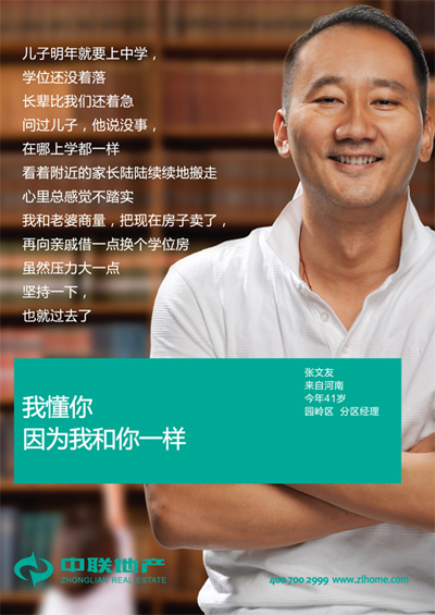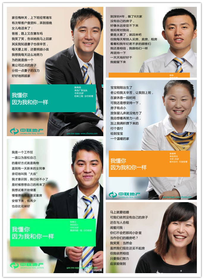 第一,形象海報中所選取的人物形象。他們都是中聯地產的內部員工,他們都是工作在中聯一線店面的員工,他們都是直接面對客戶的員工,他們都是最普通的員工。為中聯地產代言的,不是任何的明星,不是任何的名人,他們只是和大多數人都一樣的普通人。其實,員工才是企業最好的代言人,勝過明星,例如全球最大連鎖零售商沃爾瑪只用員工或員工兒女做代言或模特,既省錢又親民。