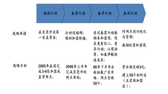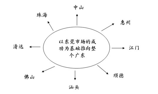 集中優勢力量在東莞市場上形成壟斷性的規模優勢進而在廣東市場形成壟斷性的規模優勢。集中優勢兵力,在最靠近深圳的東莞市場進入,在東莞開設第一家直營店,迅速占領這一周邊市場。利用試點市場,打好促銷牌,做好加盟傳播,激勵各加盟商,使其更具有信心和行動,以商招商,迅速擴張。集中積累培育未來發展所需要的人才與經驗,有效的建立跨城市運作的效率,建立配送、管理、營銷職能。一旦試點成功,迅速在接下來的 目標市場(如中山、順德等)進行復制擴張,形成區域市場主導優勢。