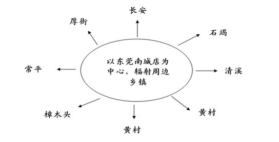 首先在東莞建立東莞南城店作為東莞網點管理中心、辦事處、樣板示范店和東莞的加盟招商接待處以及次配送中心。其次深圳總部委派管理經驗豐富、懂招商談判的店長主持東莞南城店工作,規范和制定標準的流程;及時向總部反饋信息,總部立即做出回饋且部及時協助配送與貨品調配。最后以東莞南城店為中心,輻射周邊鄉鎮,如長安、石碣、清溪、黃村、樟木頭、常平、厚街。