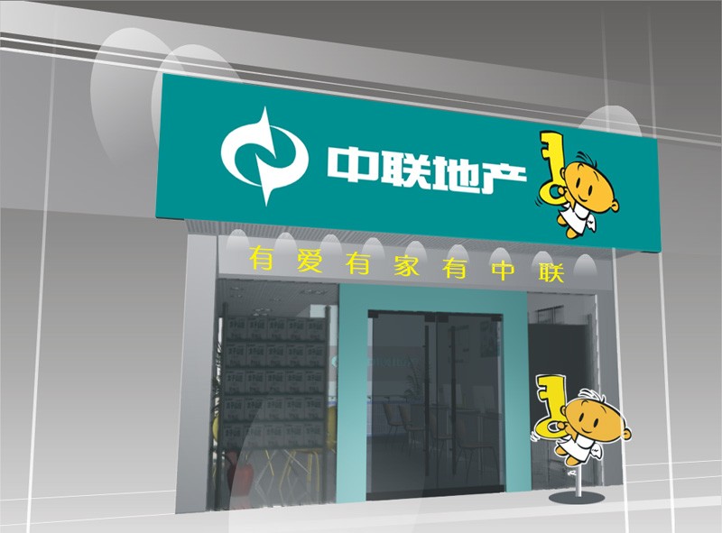 門頭和整體店面形象是最為吸引眼球和誘惑靈魂的,同時,由于門頭形象起著“畫龍點睛”的作用,必須進行統一。目前中聯的地鋪當中,新舊LOGO都在使用,LOGO的樣式不一致,而招牌上的內容也不盡相同。因此,經過精心設計,對門頭的規格、字體都進行了統一(如下圖),而且在顏色上,采用了綠底白字,區別于大部分中介的紅、黃、白三色,并加上了卡通人物,強化對消費者的第一印象。