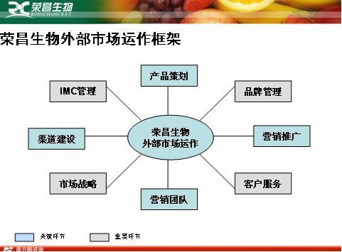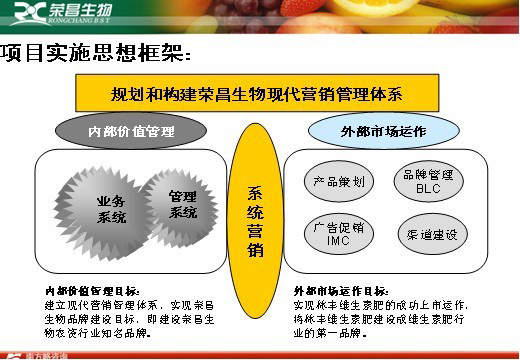 榮昌生物總體目標(biāo)是在3年內(nèi)將”榮昌”和“林豐”建設(shè)成為中國農(nóng)資市場的知名品牌,以科技和創(chuàng)新在業(yè)內(nèi)備受推崇的優(yōu)秀企業(yè)。力爭銷售額達(dá)到2.8億人民幣。并逐步將榮昌生物建設(shè)成為在維生素肥市場中集研發(fā)、生產(chǎn)、產(chǎn)品創(chuàng)新、營銷都處于領(lǐng)先的強(qiáng)勢領(lǐng)導(dǎo)品牌。