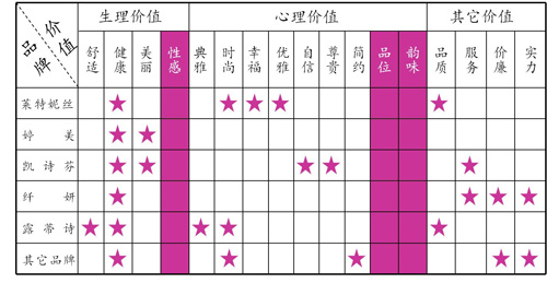 南方略發(fā)現(xiàn),調(diào)整型內(nèi)衣行業(yè)的產(chǎn)品屬性同質(zhì)化現(xiàn)象嚴(yán)重,各品牌都開始在概念上下功夫。同時,品牌價值訴求也存在嚴(yán)重的同質(zhì)化現(xiàn)象,多數(shù)企業(yè)都在吆喝自己的調(diào)整型內(nèi)衣產(chǎn)品的“健康”與“時尚”,至于“性感”、“品位”、“韻味”等概念則鮮有涉及。同時,市場中不乏染指“東方”的概念,與衣馨的“東方女性形體顧問”類似,但卻缺乏真正將其表現(xiàn)到位的品牌…… (圖5)