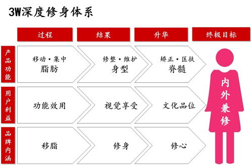 基于“內(nèi)外兼修”的理念,南方略構(gòu)建了以產(chǎn)品功能、用戶利益和品牌內(nèi)涵為維度的“3W深度修身體系” (圖6),倡導(dǎo)分別以“移脂”為過程、“修身”為結(jié)果、“修心”為升華的“3W深度修身”新風(fēng)潮。并建議將“品位”和“韻味”作為衣馨品牌的核心價值,建立以“韻味”為核心的品牌價值體系,一方面深化衣馨品牌的內(nèi)涵與外延,一方面建立起于競爭品牌之間的區(qū)隔。(圖7)