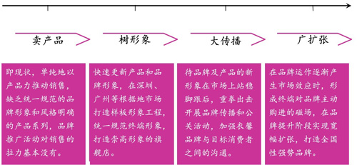 為了配合實現(xiàn)成為區(qū)域知名品牌的近期目標(biāo),及行業(yè)領(lǐng)導(dǎo)型品牌的長期目標(biāo),南方略為衣馨描畫的是這樣的一條路徑(圖9),即是:以產(chǎn)品品質(zhì)為驅(qū)動,重新塑造別具特色的品牌形象,再針對品牌的個性和核心價值進行多層次、全方位的整合營銷傳播,建立起衣馨品牌在目標(biāo)消費者心智中的獨特占位,穩(wěn)固推進終端零售網(wǎng)點的擴張以及品牌戰(zhàn)略的穩(wěn)固向前,最終實現(xiàn)品牌的可持續(xù)發(fā)展。
