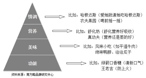 如上圖所示,這可以說是馬斯洛需求層次理論在食品行業(yè)中的實踐版。從消費者需求層次層面來劃分的話,食品的價值屬性由低到高可歸結為四類:功能、美味、營養(yǎng)和情調。
