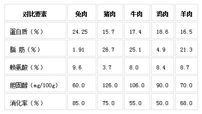 現(xiàn)代科學研究表明,兔肉營養(yǎng)價值豐富,纖維細嫩,味道鮮美,適合現(xiàn)代生活對肉質的要求。兔肉具有高蛋白(含蛋白質21~23%)、高賴氨酸(賴氨酸占蛋白質的9.6%)、高消化率(達85%)、高煙酸(高達12.8毫克/百克);低脂肪(僅為4.9%)、低膽固醇(為65毫克/百克)、低脲酸、低熱量等特點。因此,兔肉自古以來便享有“葷中之素”的美稱。
