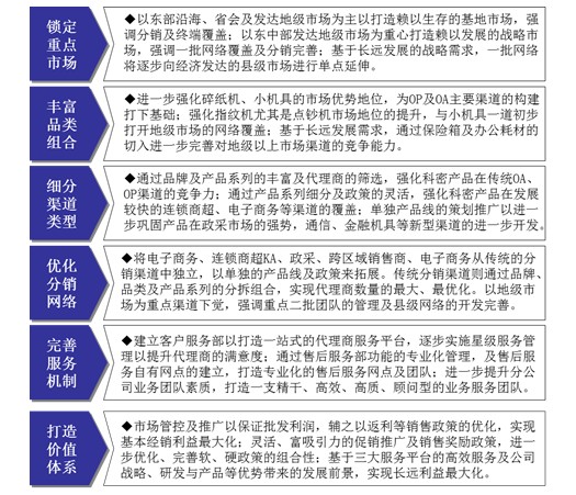 鎖定重點市場、豐富品類組合、細分渠道類型、優(yōu)化分銷網(wǎng)絡(luò)、完善服務(wù)機制、打造價值體系是“蜂巢工程”賴以成功的六大基石。