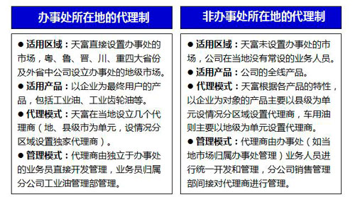 天富的代理制分兩種形式:辦事處所在地的代理制、非辦事處所在地的代理制。