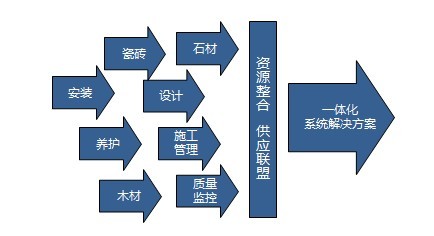 通過外部資源整合、供應端口的戰略聯盟,將客戶所需要的資源以最終裝飾效果為目標呈現在客戶面前,形成系統方案,真正為客戶提供一條龍式的整合服務。