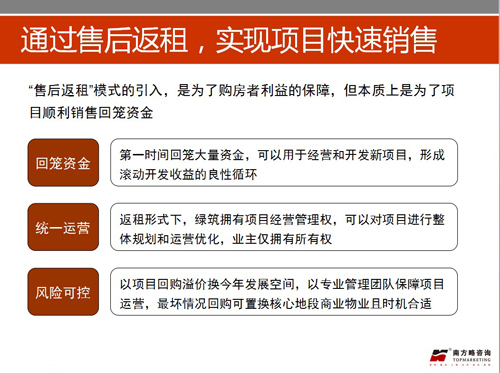3、項(xiàng)目的商業(yè)產(chǎn)品,體量3萬(wàn)余方,在三四級(jí)城市可謂不大不小,但萬(wàn)州整體商業(yè)市場(chǎng)已被前期進(jìn)入市場(chǎng)的萬(wàn)達(dá)金街、其它樓盤(pán)項(xiàng)目底商所擠壓,而且區(qū)域內(nèi)不論是居住人口還是社區(qū)底商的開(kāi)業(yè)率都非常低,現(xiàn)在進(jìn)入,只能享受價(jià)值升值空間,短期內(nèi)難以獲得穩(wěn)定收入,因此,項(xiàng)目組經(jīng)過(guò)深思熟慮,提出“售后返租“或“租售結(jié)合”的復(fù)合營(yíng)銷(xiāo)模式。“售后返租“模式的引入,本質(zhì)上還是為了項(xiàng)目順利銷(xiāo)售回籠資金。