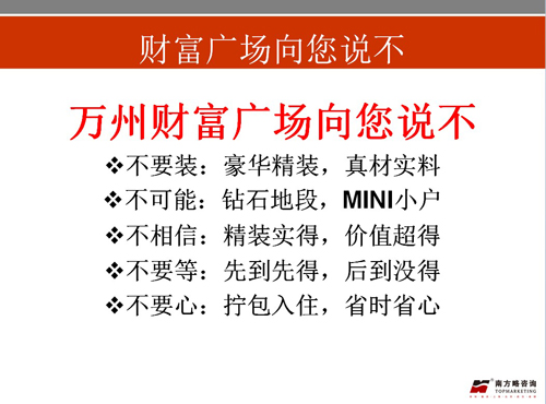 在第一輪強銷階段,配合MINI戶型產品的推出,深度挖掘產品特性,推出“不要裝、不可能、不相信、不要等、不要心”系列“財富廣場向您說不”廣告,打破常規,牢牢抓住消費者眼球,開展“逆向思維”廣告宣傳攻勢,在前期媒體宣傳的基礎上,增加“開盤活動(事件營銷)、DM單面派發、社區海報張貼”等動作營銷,把視覺與行動緊密聯合起來,把宣傳勢頭推向一波高潮。