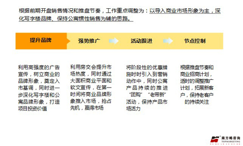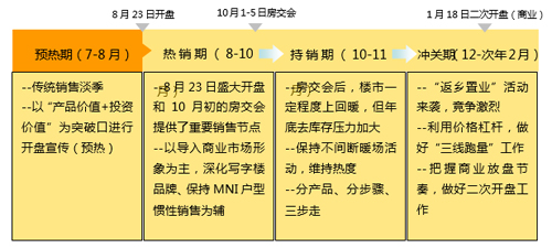 營銷策略:根據開盤銷售情況和推盤節奏,結合房交會重要銷售節點,工作重點調整為:以導入商業市場形象為主,深化寫字樓品牌、保持MNI戶型慣性銷售為輔的思路。