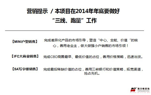 營銷策略:核心在于對客戶需求的把握,細節的項目展示和氛圍營造,巧妙的價格杠桿應用、有效的開盤控制、精準的渠道選擇缺一不可,在2014年年底最大限度做好“三線、跑量”工作。