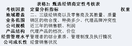 ◆ 厘定經銷商標準 招商就如找對象談戀愛結婚生子,非常重要。經銷商的厘定擇用,關系到后期招商政策制定執行,關系到分銷網點覆蓋目標市場的密度,關系到銷售目標業績,乃至關系到今后經銷商輔導與支援、激勵、控制等工作的進展。通常經銷商厘定主要內容有:經銷商原則、選擇條件、判斷標準以及經銷商調查、評定與甄別等。如何厘定經銷商試以下表格來主述: