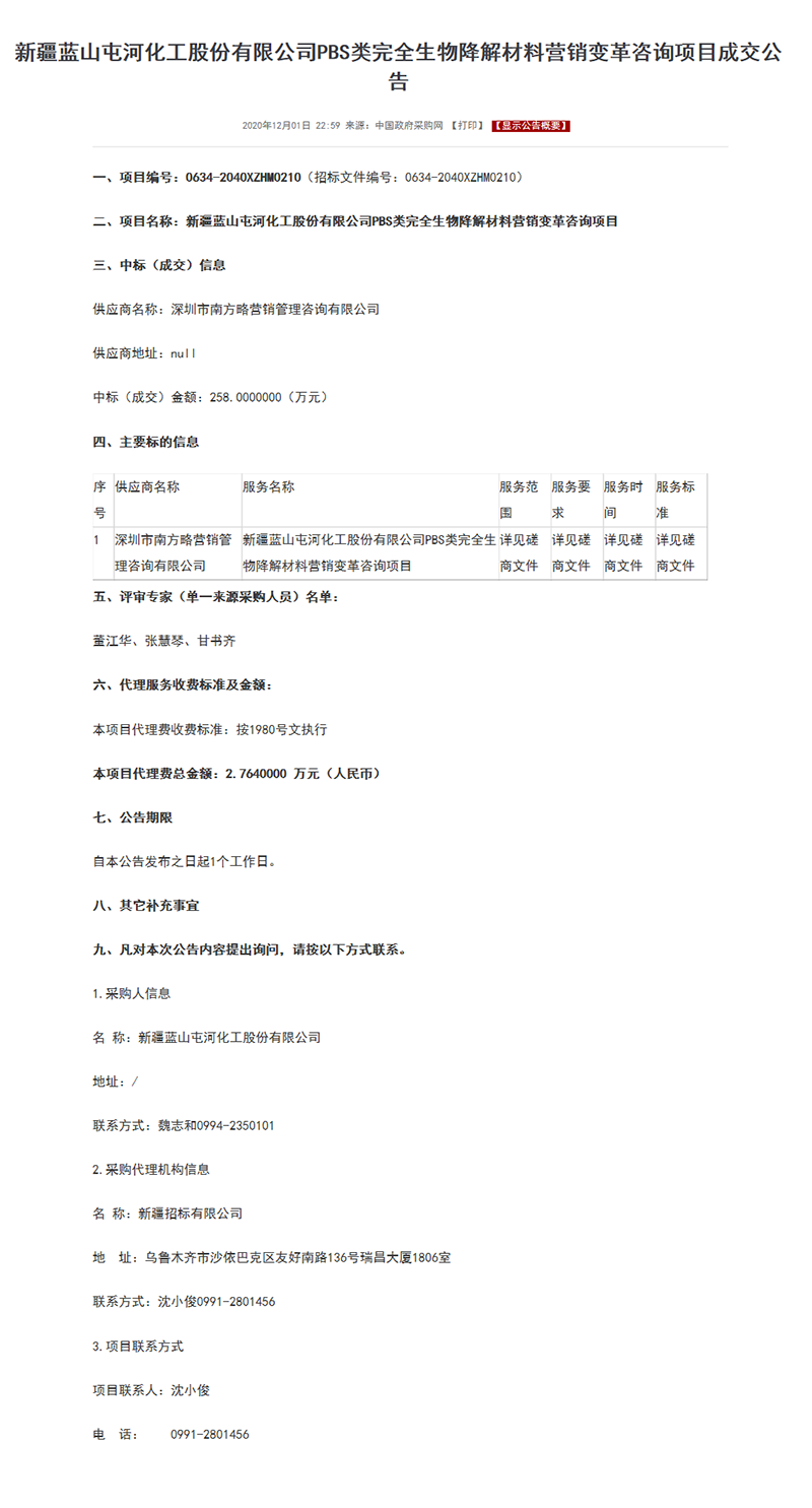 中標!南方略營銷管理咨詢集團中標新疆藍山屯河化工股份有限公司PBS類完全生物降解材料營銷變革咨詢項目,中標金額:258萬元!