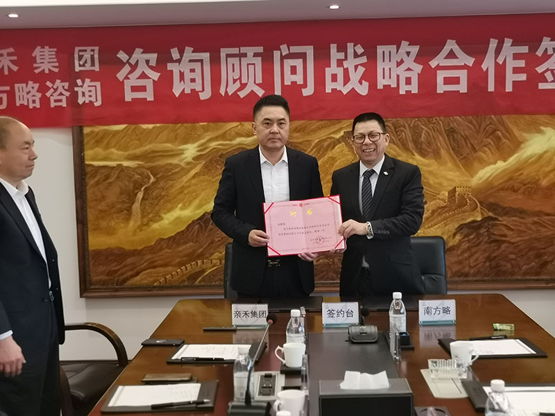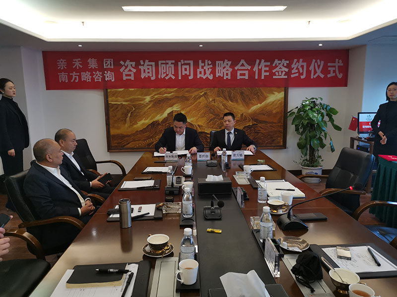 2021年11月20日,為進一步推動集團高質量規模化發展戰略,重慶親禾集團與南方略咨詢在親禾集團總部正式簽訂《咨詢顧問戰略合作協議》,南方略咨詢董事長劉祖軻老師、副總裁王清華老師與親禾集團董事長鄧華先生、副總裁左久林先生等兩家公司的主要領導集中到場,共同參與和見證了此次合作。