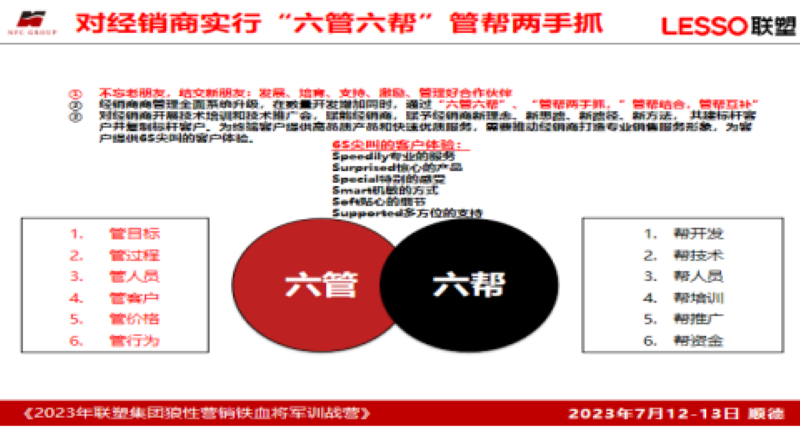 三是渠道經(jīng)銷商的管理與賦能體系,聯(lián)塑集團(tuán)在全國有3000多個(gè)一級經(jīng)銷商,是管道行業(yè)分銷之王,渠道非常龐大,南方略咨詢公司總結(jié)了一套經(jīng)銷商“六幫六管”的體系,劉祖軻老師說:“對經(jīng)銷商的管理就是最好的服務(wù)”,一下子顛覆了大家的觀念,馬上找到感覺和方法。