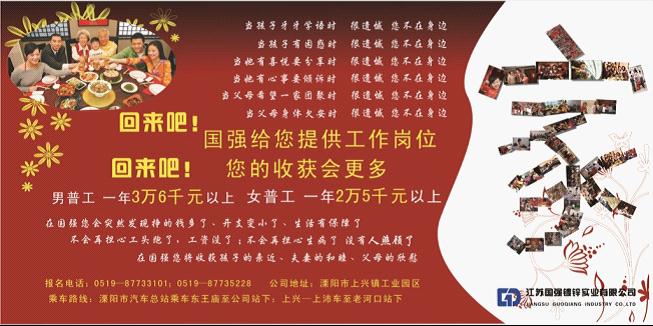 江蘇國強鍍鋅實業有限公司(國強)是南方略2010-2011年度服務的一家非常優秀的客戶,而該廣告正是項目組老師收集的國強今年春節系列招工廣告中的其中一則。南方略領軍人物劉祖軻認為,這則廣告集中體現了招工難引發企業在招聘方式上發生的四大轉變。