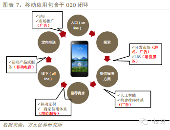 我們認為,移動互聯(lián)網(wǎng)的三種盈利模式,廣告、電商、增值服務(wù)均體現(xiàn)在O2O閉環(huán)中。成熟的移動商業(yè)模式應(yīng)該成為一個閉環(huán),從通過極致的產(chǎn)品和服務(wù)獲取用戶開始,通過線上入口進行移動搜索(結(jié)合LBS)來獲取用戶需求,運用語音識別、人工智能等方式為用戶提供解決方案,并為用戶推薦商家,形成線上到線下的引流。當用戶消費結(jié)束后,利用移動支付進行交易,并通過社交工具反饋至線上入口。整套閉環(huán)系統(tǒng)涉及環(huán)節(jié)包含線上入口、移動搜索、LBS、移動支付、線下商戶、社交等各方面。下圖的紅字部分將成為盈利的切入點,主要包括廣告、電商、增值服務(wù)三種盈利模式。