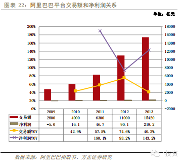 我們認為O2O生態(tài)體系內(nèi)各環(huán)節(jié)建設(shè)類似阿里巴巴電商平臺,但包含更多元素,更為復(fù)雜。通過下圖阿里巴巴平臺交易額和凈利潤的增長關(guān)系可以看到,互聯(lián)網(wǎng)平臺業(yè)績爆發(fā)的前提是生態(tài)內(nèi)的商戶賺到錢,這樣才有可能在生態(tài)內(nèi)投入更多的推廣費和增值服務(wù)費。但是我們觀察O2O體系內(nèi)的線下商戶盈利情況發(fā)現(xiàn),目前傳統(tǒng)行業(yè)以及垂直平臺還未從O2O大幅盈利,所以我們認為2014年純線上互聯(lián)網(wǎng)公司無法享受O2O紅利,移動互聯(lián)網(wǎng)O2O業(yè)務(wù)還無法對其貢獻業(yè)績。