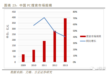 PC互聯(lián)網(wǎng)的搜索形態(tài)主要是以信息搜索為主,市場格局百度一家獨大,2013年搜索市場規(guī)模達到394.5億。