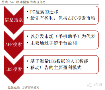 我們認為移動搜索的市場規(guī)模不會低于PC搜索,但是其表現(xiàn)形態(tài)更為復(fù)雜,主要表現(xiàn)為三類:信息搜索、APP搜索、基于LBS的精準推薦,其中最大的市場是基于LBS的精準推薦。