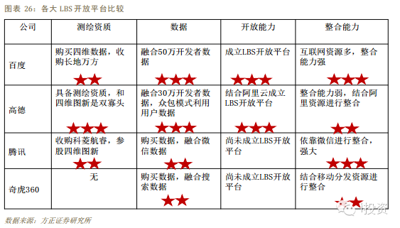 1)上游:具備測繪資質(zhì)的基礎(chǔ)地理信息采集商資源非常稀缺,阿里巴巴通過收購高德軟件,騰訊通過參股四維圖新的方式占據(jù)了LBS產(chǎn)業(yè)鏈的上游。