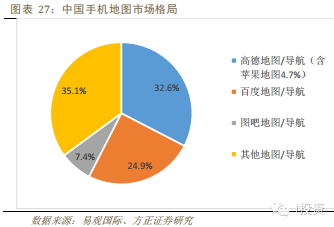 2)中游:導(dǎo)航軟件廠商分布較為分散,且未來導(dǎo)航軟件可被整合進入手機地圖,具有被顛覆的風險。手機地圖目前市場較為集中,由于手機地圖直接面向用戶,在馬太效應(yīng)下,未來會強者恒強,市場的集中度會進一步加大。目前手機地圖市場上,百度和高德處于領(lǐng)先位置。