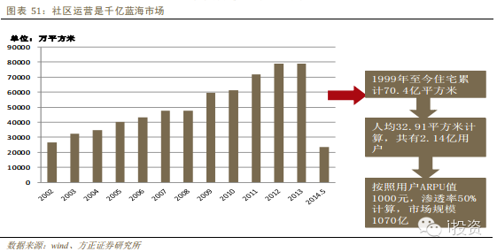 社區(qū)運營:中國經(jīng)歷了房地產(chǎn)發(fā)展的黃金十年,已經(jīng)積累了海量的存量住戶,但是房地產(chǎn)現(xiàn)有的商業(yè)模式并未將這些存量住戶的價值開發(fā),用互聯(lián)網(wǎng)思維對傳統(tǒng)物業(yè)進行改造,可以爆發(fā)一個千億級的新市場。從2000年至2014年,新增商品房住宅累計達到70.4億平方米,若按照人均32.91平方米計算,共有2.14億用戶。由于基于社區(qū)的服務(wù)項目包括物業(yè)、水電煤以及多項日常生活開支,所以按照單個用戶貢獻1000元/年,滲透率50%計算,年市場規(guī)模達到1070億元。