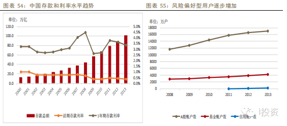 我們認為,目前金融市場最大的用戶痛點就是收益率和風險無法完全匹配,也是互聯(lián)網(wǎng)金融可以去顛覆的方向。從下圖可以看到,2013中國存款總額達到100.9萬億,同比增加14.3%,但活期利率和一年期利率都出現(xiàn)下降趨勢,同時風險偏好型用戶逐步增加,但并無法獲取對應(yīng)的高收益率。我們認為,目前中國互聯(lián)網(wǎng)金融市場的潛在空間巨大,但發(fā)展需要耐心。
