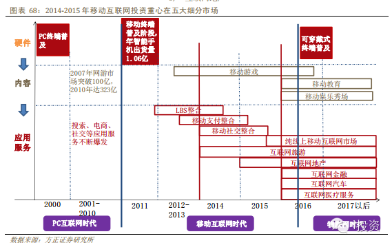 移動互聯(lián)網(wǎng)的發(fā)展的各環(huán)節(jié)有一定的時間順序,從下圖的時間軸可以看到,2014-2015年依次發(fā)展的細分市場有: